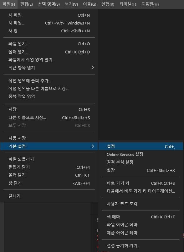 해결방법은 파일 > 기본 설정 > 설정