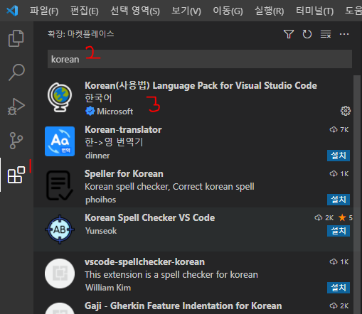 좌측에 마켓플레이스 클릭 > korean 검색 > Korean(사용법) Language Pack for Visual Studio Code를 설치하고 vscode를 완전히 껏다가 재시작하면된다.