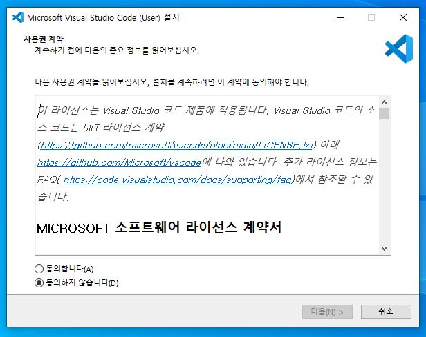 3. 설치를 진행하기 위해서는 사용권 계약에 동의를 해야한다. '동의합니다'를 선택한 후 다음버튼 클릭