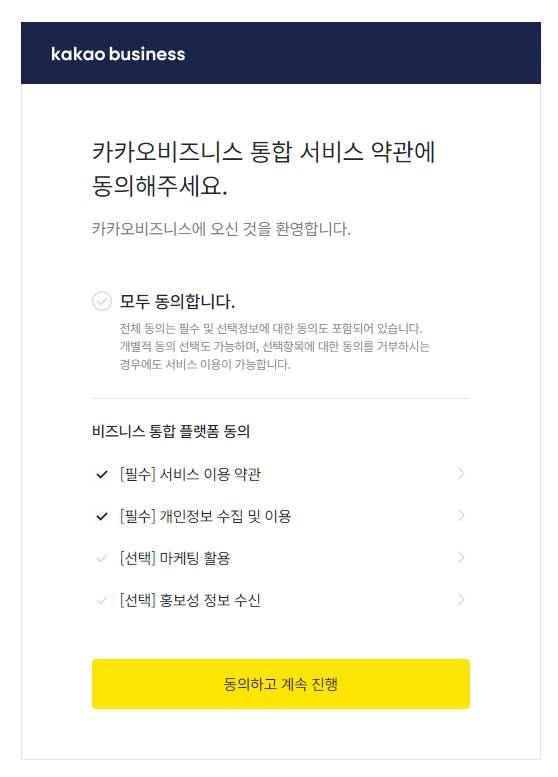 마케팅 활용 등은 필수사항이 아니기 때문에 체크하지 않았다.