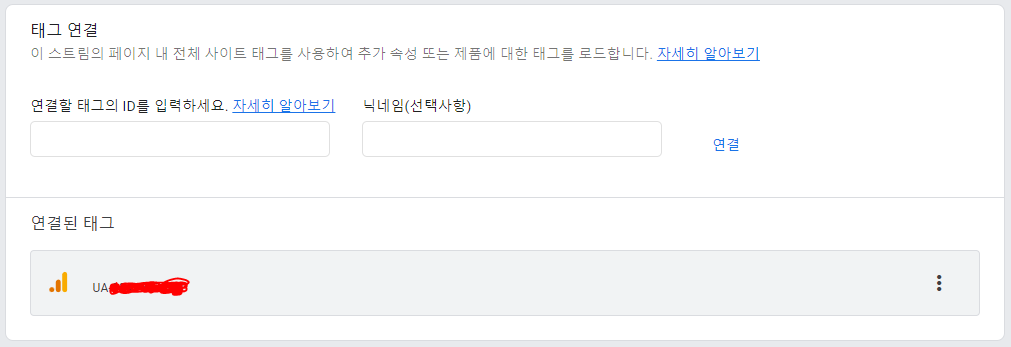 어떤 분들은 연결된 사이트 태그를 눌러서 표시되는 UA- 코드를 티스토리에 등록해야 한다고 말한다.