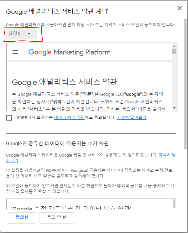 6. 대한민국으로 약관 내용을 변경하고, 동의한다.
